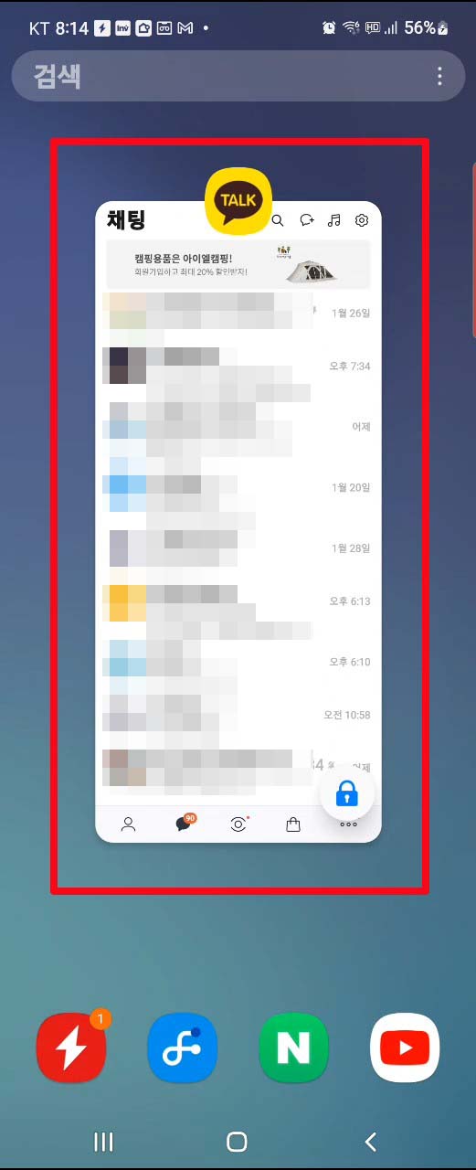 다른 어플들은 모두 없어졌지만 카톡은 그대로 남아있죠? 이렇게 본인이 자주 쓰는 어플은 고정해 두시고 다른 어플들은 모두 닫기 하면 되니까 빠른 실행기능을 훨씬 더 효율적으로 사용할 수 있습니다.