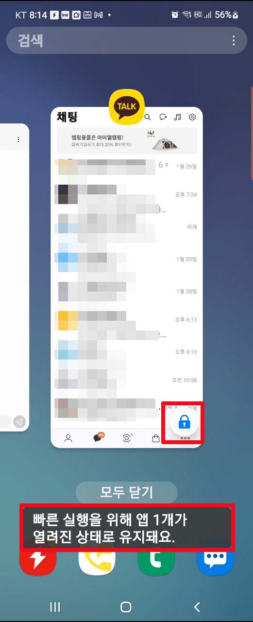 이제 카톡에 잠금표시가 나오면서 빠른 실행을 위해 앱 1개가 열린 상태로 유지된다는 알림이 뜹니다. 한번 해볼까요?