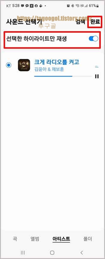 하이라이트 재생은 듣고 싶은 부분만 나오도록 하는 건데 처음부터 나오시길 원하시면 체크를 해제해 주세요.