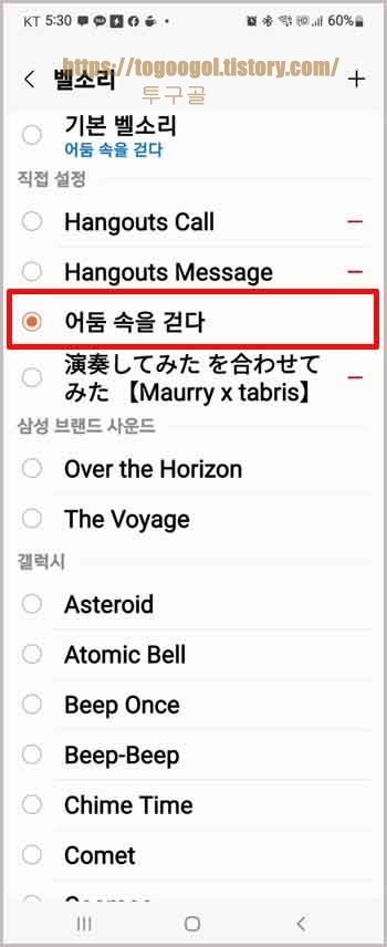 원하시는 벨소리를 선택해 줍니다.