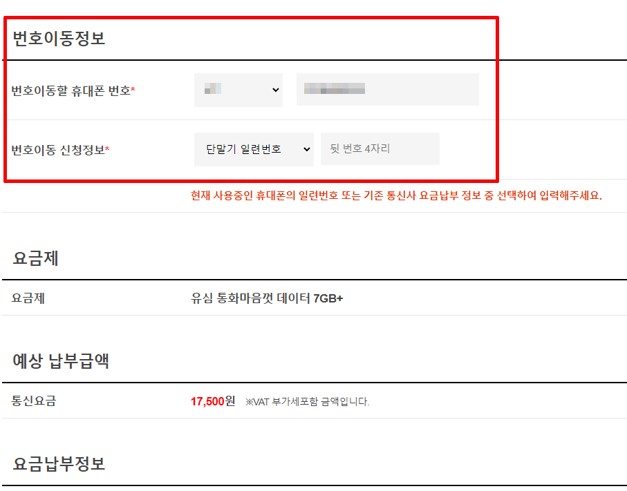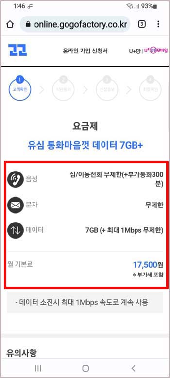 온라인 접수로 들어가면 신청화면이 나오는데요. 우선 선택한 요금제가 맞는지 확인해야겠죠? 전화/문자 무제한 데이터는 7GB 기본 제공에 이후 속도가 줄면서 무제한이라는 설명이 보입니다. 한 달 요금도 17,500원 맞네요