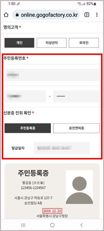 고객정보를 확인하는 화면인데요. 신분증은 사진으로 제출할 필요 없이 주민등록증에 있는 발급일자를 넣어주면 되네요.