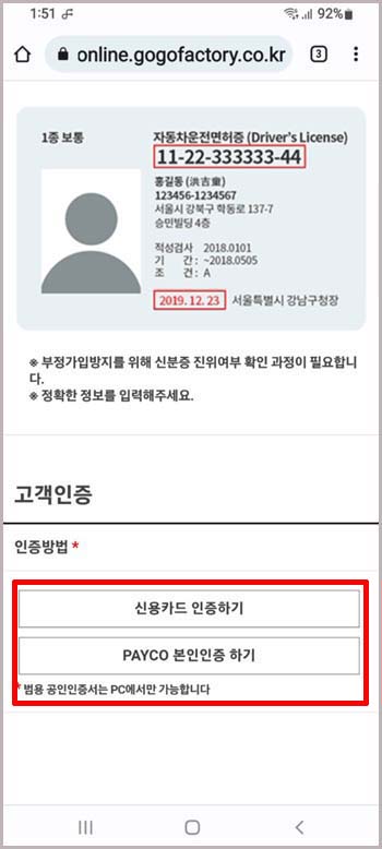 저는 운전면허증으로 고객정보를 확인했고 인증은 모바일에서는 본인 명의 신용카드나 PAYCO 인증이 가능하고 PC는 공인인증서도 가능하네요. PAYCO는 플레이스토어에서 다운로드하여서 진행하시면 쉽게 됩니다. 편리한 방법으로 진행하시면 되세요.