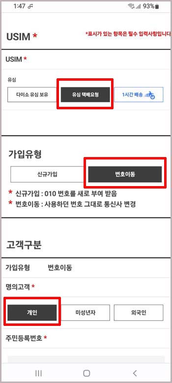 유심은 다이소에서 구입해도 되는 모양인데 그러면 유심비도 내가 지불해야 하고 저는 급한 게 아니어서 그냥 택배 요청으로 신청했습니다. 당연히 통신사를 바꾸면서 내 번호는 그대로 써야 하니까 번호이동에 체크를 하고요. 개인에 체크를 해줍니다. 자녀분들이 가입하는 경우에는 미성년자를 체크하면 되겠죠?