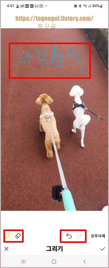 이렇게 글자나 그림을 넣을수 있고요. 지우기나 뒤로 가기로 수정도 가능합니다. 체크!!!