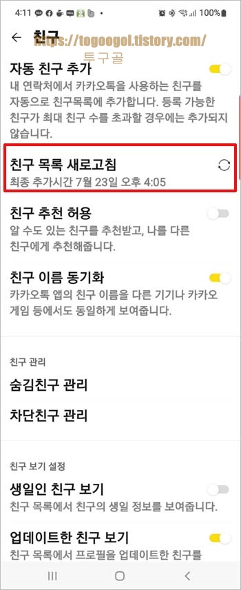 이럴 때 있으시죠? 연락처에는 저장해 둬야 하지만 카톡에 친구 추가까지는 좀~그런 관계?^^ 택배 기사님 연락처 일수도 있고 거래처 일수도 있겠죠. 이런 경우는 가장 대표적인 방법이 카톡 설정에서 자동 친구 추가 기능을 비활성화시켜 주면 되지만 다른 사람들은 자동으로 추가되면서 특정한 사람만 추가하고 싶지 않을 경우에는 아주 간단한 방법으로 해결이 가능합니다. 쉬우니까 빨리 따라오세요.