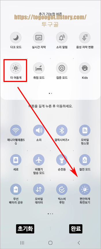 아래 보시면 더 어둡게가 보이시죠? 활성화해주세요. 그럼 바로 적용이 됩니다. 매번 설정으로 들어가려면 불편하겠죠? 퀵패널에 아이콘을 추가해 간편하게 사용하는 방법도 있습니다.