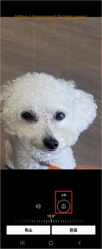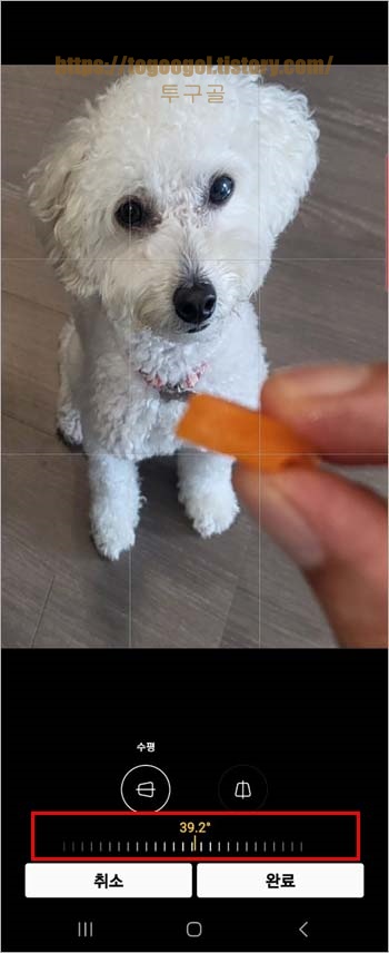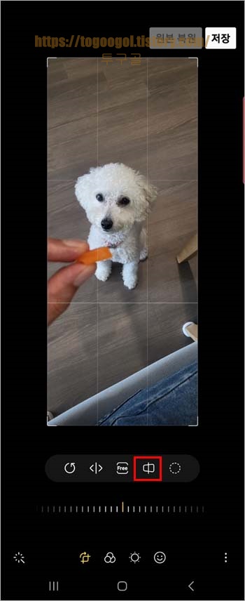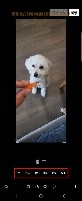 사진 비율을 1:1 3:4 9:16 FULL 등 자유롭게 변형해 주는 기능인데요. 원하는 크기로 변경하고 손가락으로 사진의 위치를 조정해 줄 수 있습니다. 댕댕이 얼굴이 사진의 중앙에 오도록 변경해 주면 되겠죠?^^