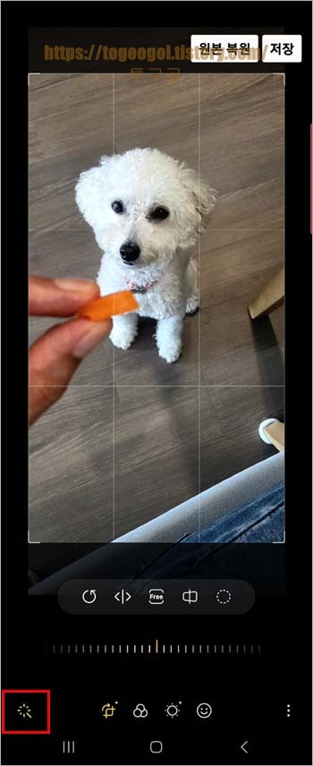 우선 편집하고 싶은 사진을 하나 불러옵니다. 저희 집 댕댕이한테 당근을 주는 사진인데요^^ 아래 연필 버튼이 편집 버튼입니다.